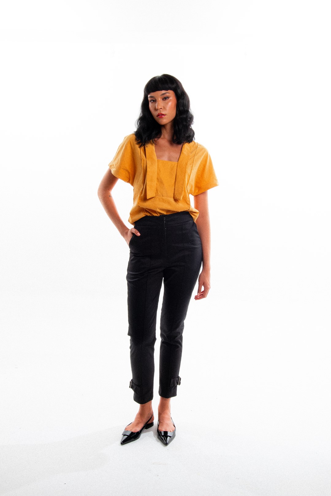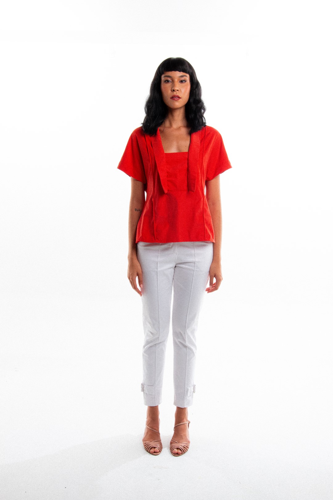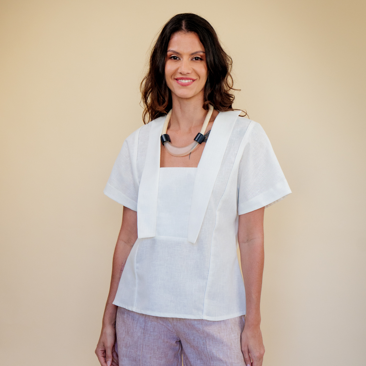 Bata com recortes e decote quadrado, a Bata Piano possui detalhes em abas nas laterais do decote e detalhes em vivo que vão do ombro até a base e alongam a silhueta. A Bata Piano é soltinha e suas mangas são inteiras, formando um design moderno e super autêntico.