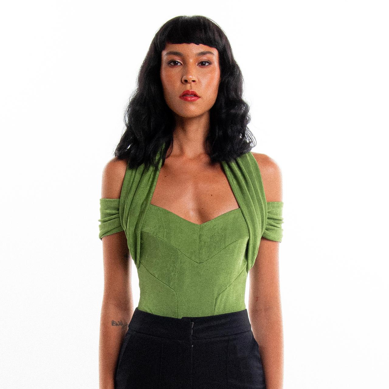 Disponível nas cores preto, verde abacate, vinho e rosa goiaba (esse último com um delicado brilho dourado), o Body Violino é destaque em qualquer produção! Experimente combiná-lo com a Calça Flauta ou o Short Violão.