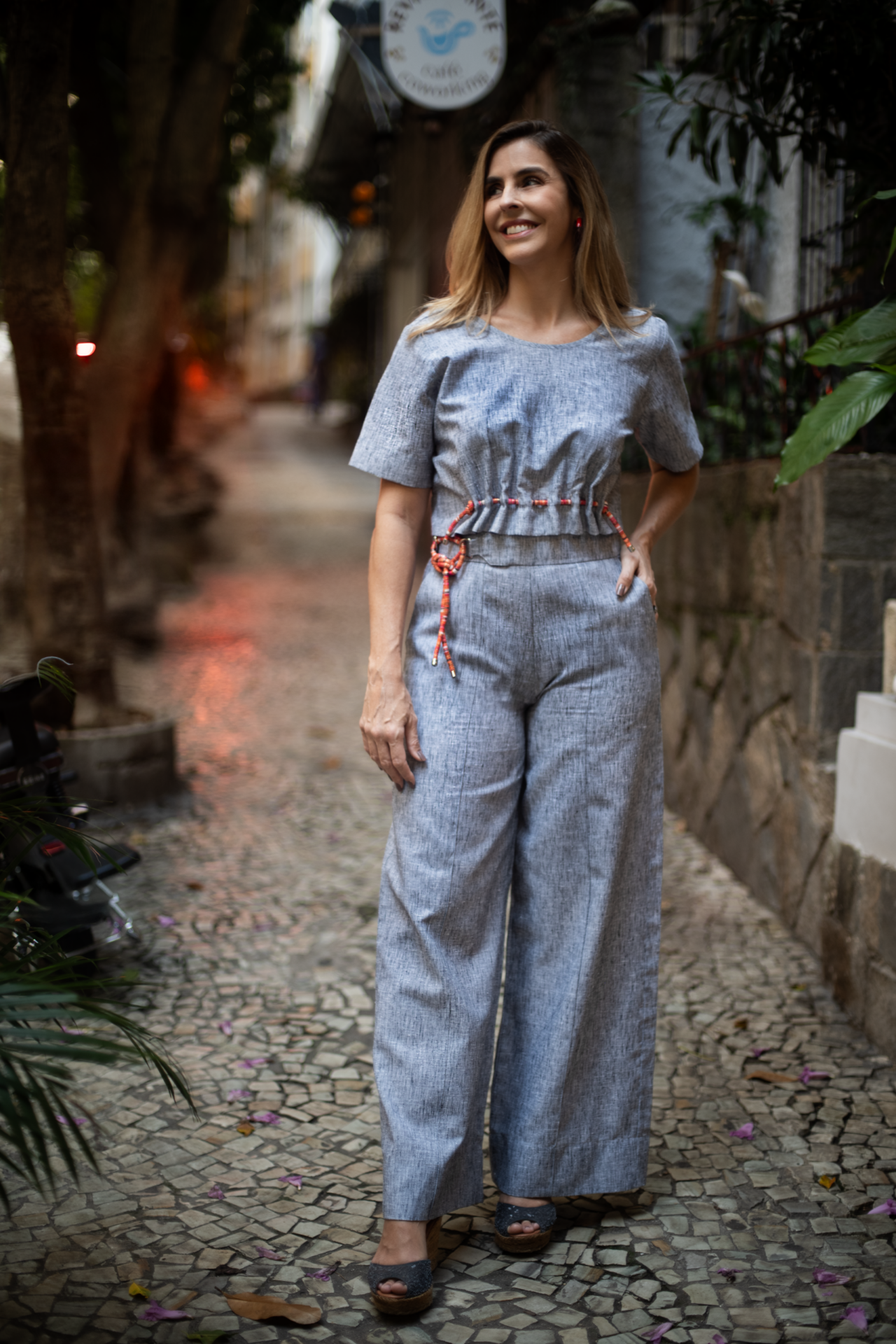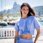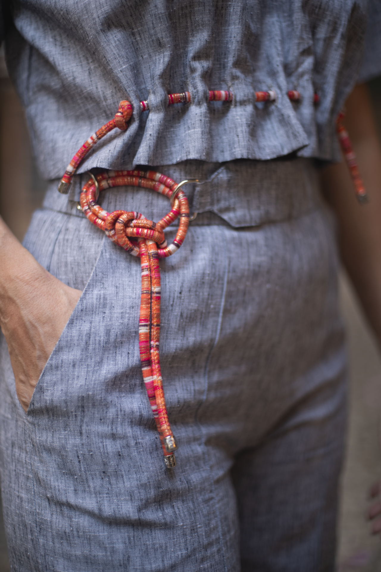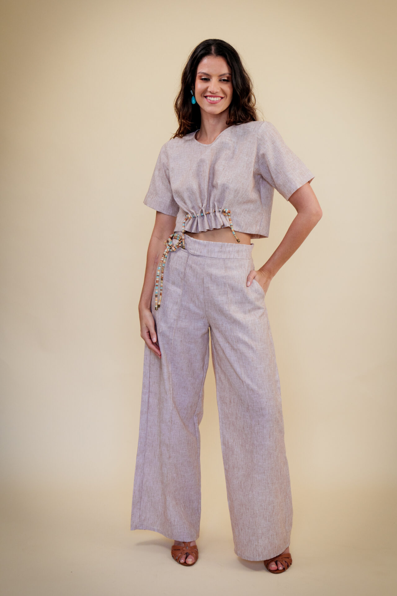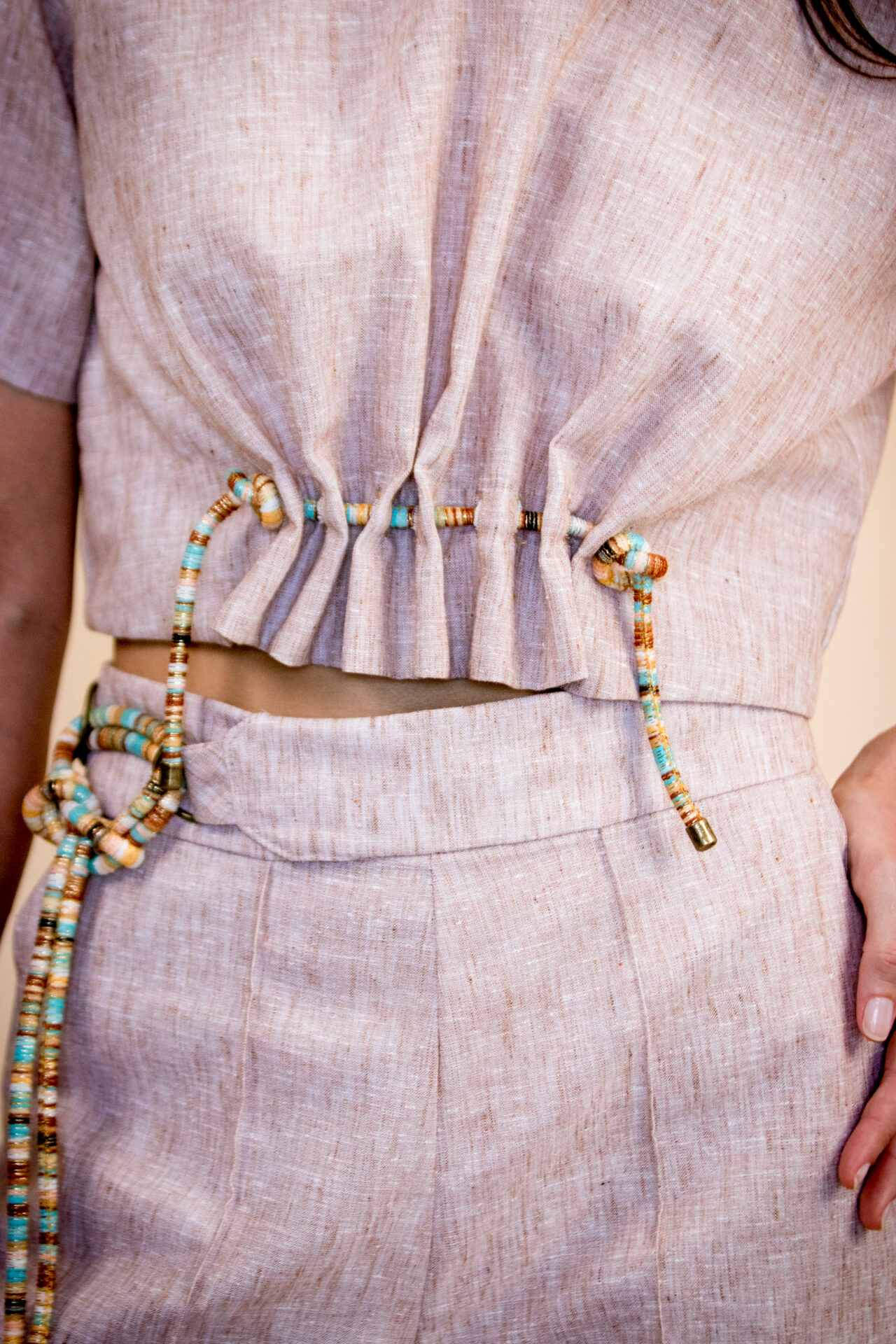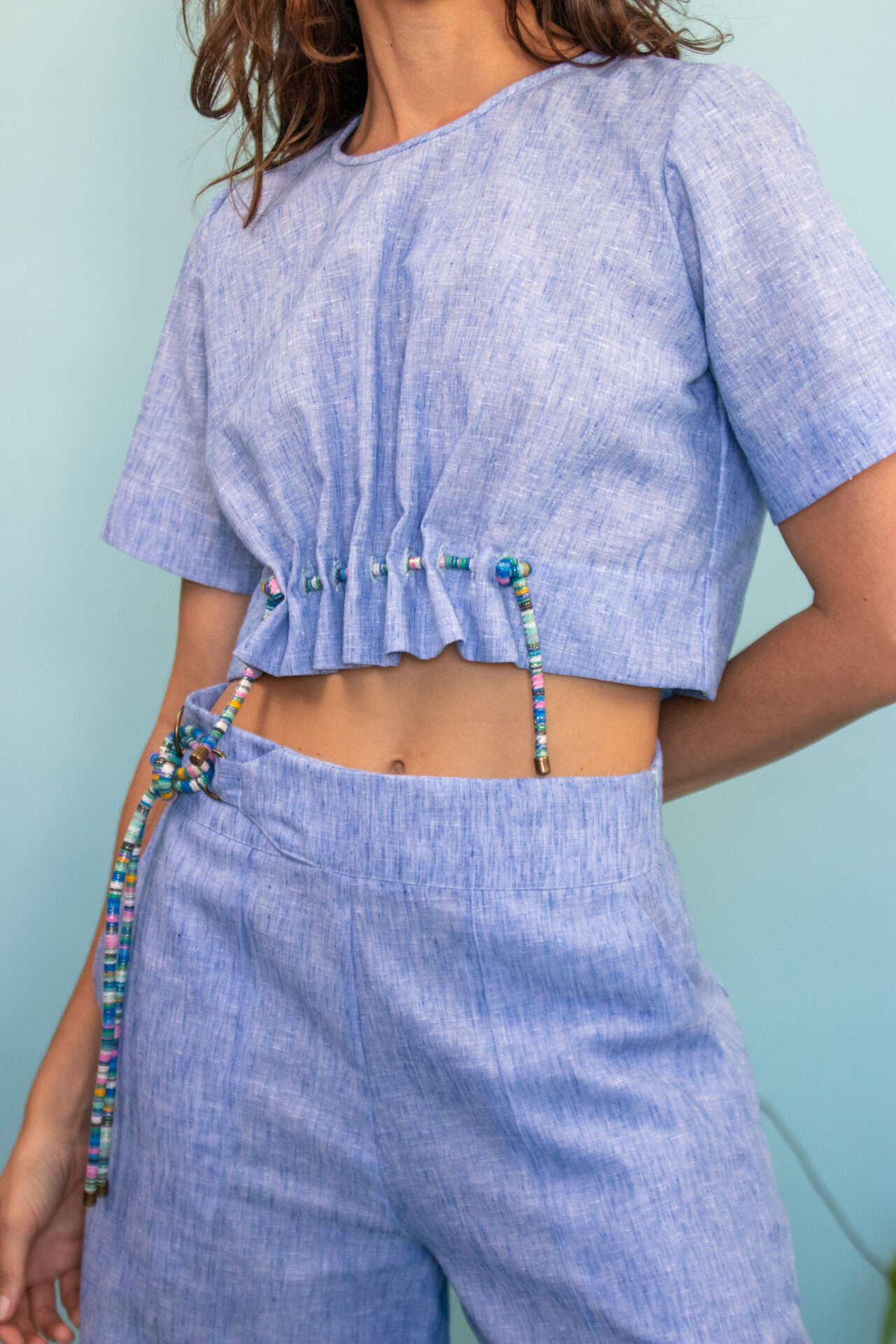 • Modelagem e ajustes: Corte cropped com comprimento alinhado à cintura alta da Calça Bossa — cria uma silhueta equilibrada e moderna. Atenção especial ao detalhe de corda entrelaçada com ponteiras de metal, formando um franzido. A cor da corda faz um contraste moderno com a cor do tecido.