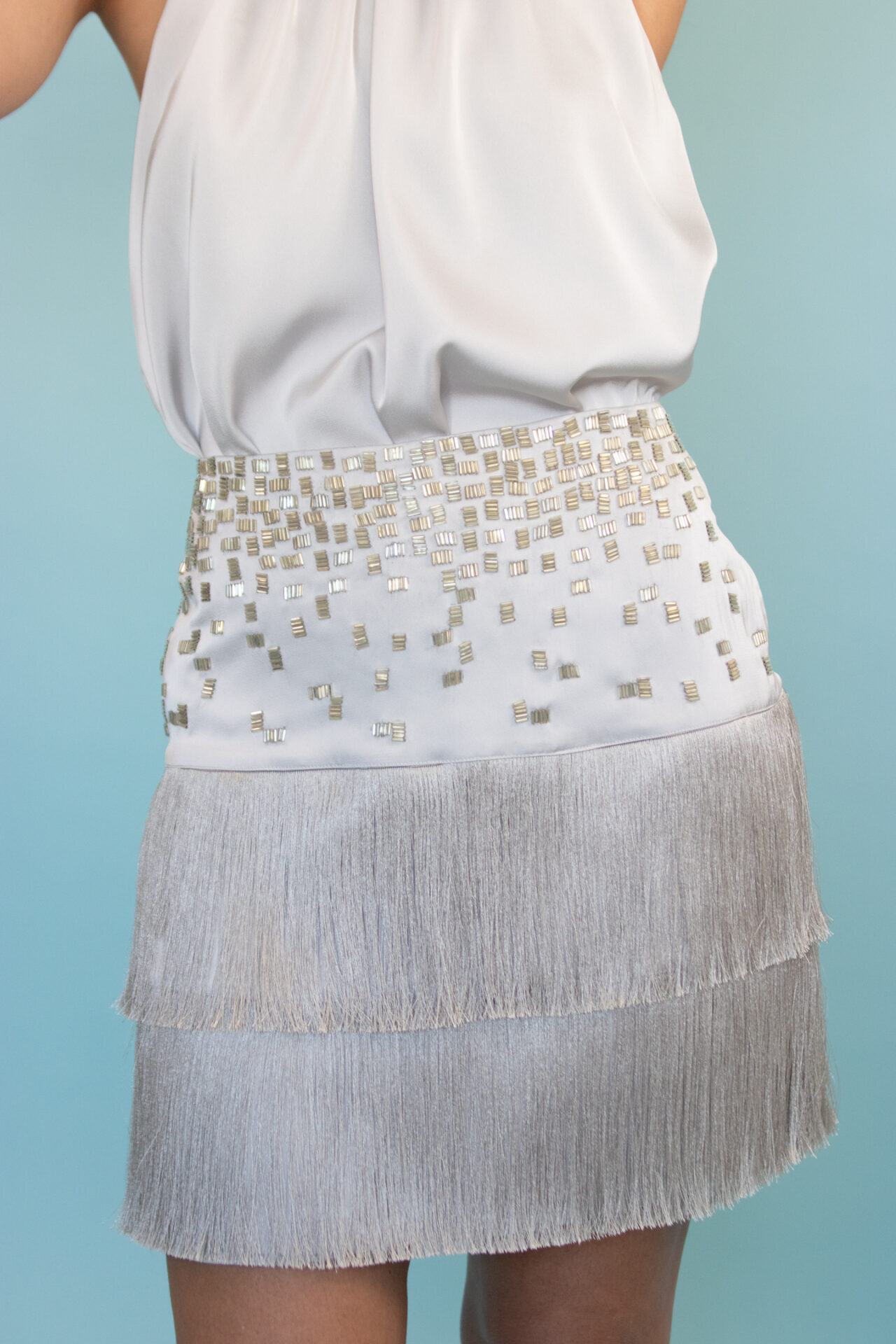 A Saia Rock é uma preciosidade! Feita em crepe acetinado na cor prata aço, possui bordado em canutilhos que formam um desenho de degradê. Além disso, é rodeada por duas fileiras de franjas, que destaca o movimento de quem veste!