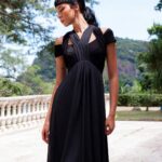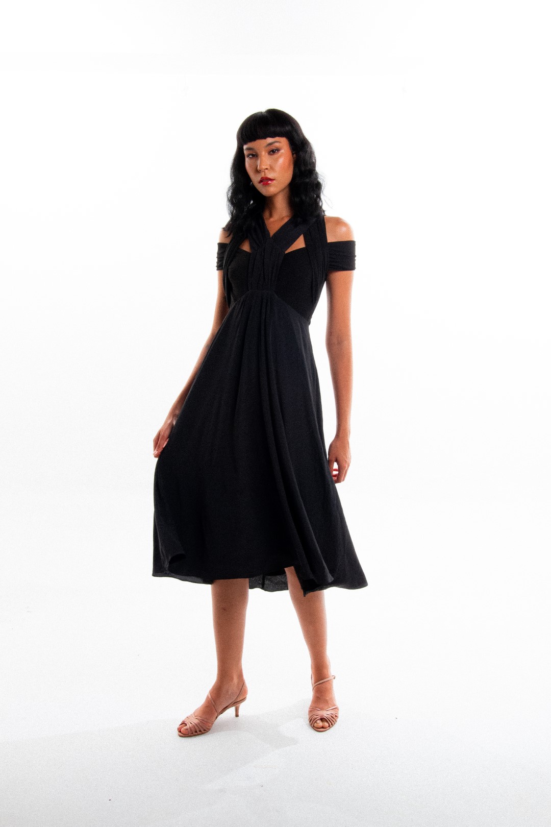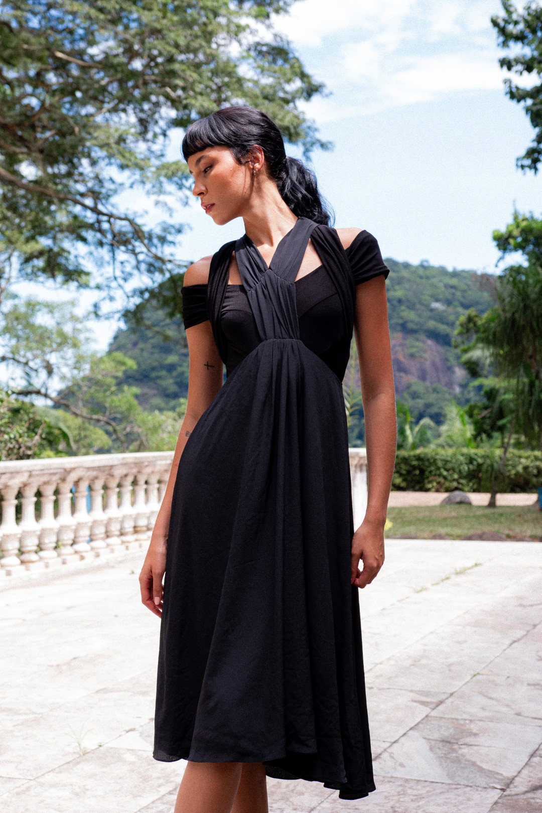 Confeccionada em crepe, possui detalhe franzido na parte central e alças cruzadas nas costas. As alças contam com elástico embutido, para melhor vestibilidade em qualquer silhueta. A parte da saia possui forro e é no comprimento mídi.