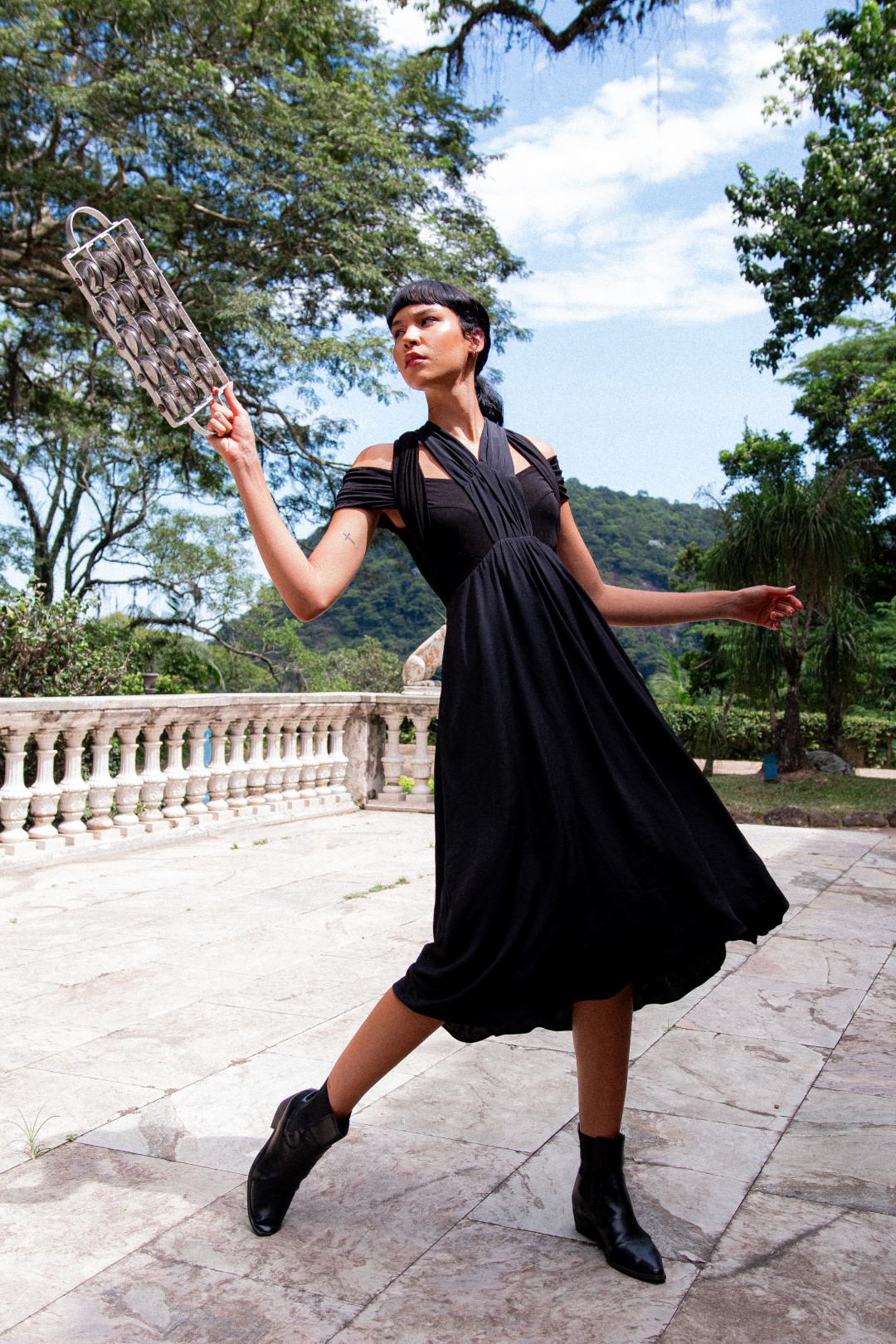 A Salopete Guitarra fica incrível combinada com o Body Violino, formando um desenho interessante com as alças das duas peças. Você pode usá-la com um coturno, um scarpin, uma sandália de salto ou até mesmo tênis!