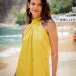 Confeccionado em dois tecidos. O primeiro, um linho misto, disponível nas cores Marrom Guaraná e Bege Cru, tem toque macio, é leve e fresco. O segundo tecido é um crepe acetinado de caimento fluido, na cor amarelo siciliano, um hit do verão!