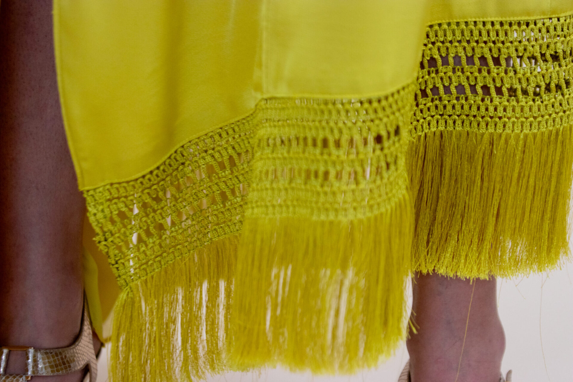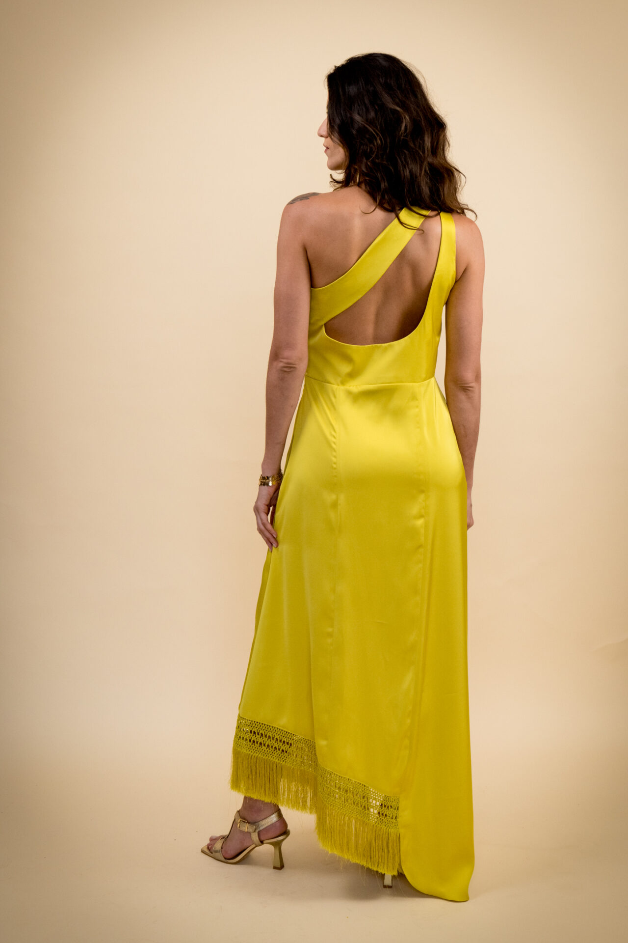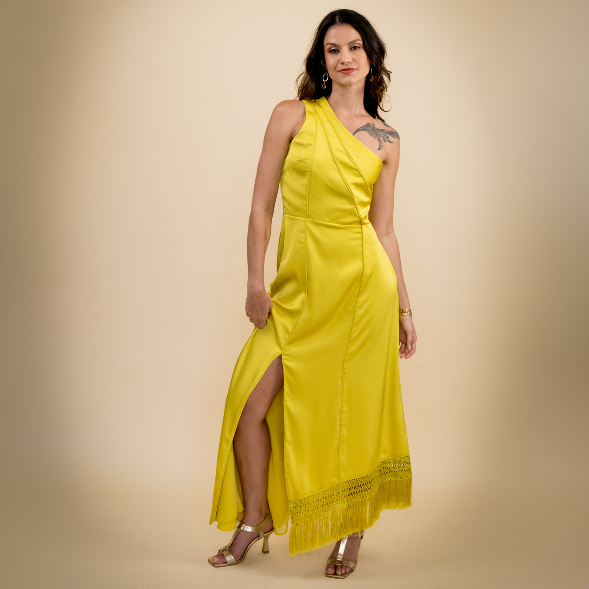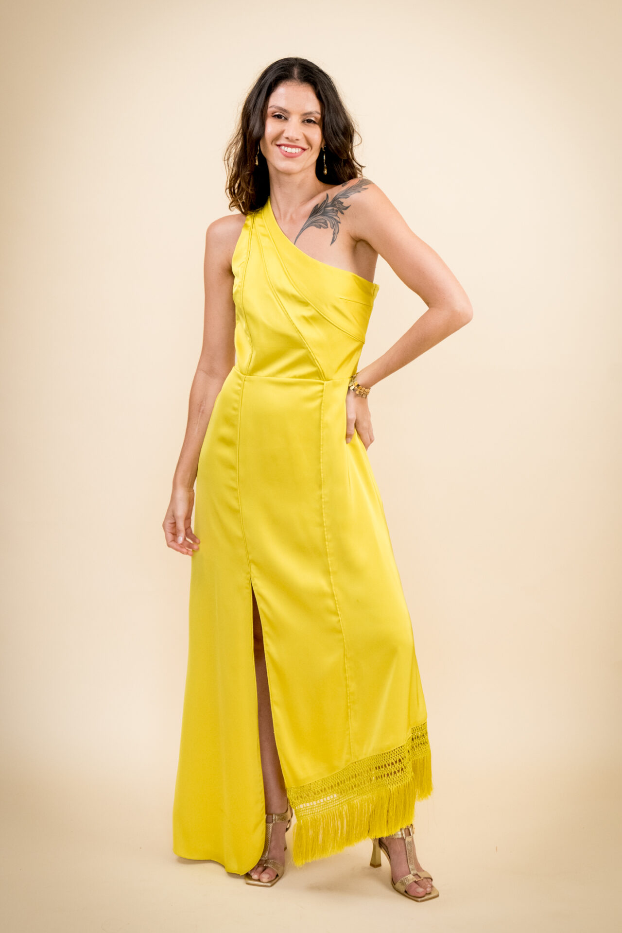 Com design nada óbvio, o Vestido Gafieira Festa é confeccionado em crepe acetinado. Possui ombro único, franjas com macramê na barra da saia, fenda, recortes com vivos e costas com um desenho super moderno. A cor amarelo siciliano é a cereja do bolo, conferindo ainda mais autenticidade à peça.